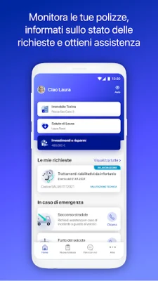 In caso di necessità, gli utenti possono richiedere le prestazioni di assistenza incluse nelle loro coperture direttamente dall'app. Inoltre, è possibile segnalare un sinistro per le polizze danni in pochi e semplici passaggi e ottenere informazioni aggiornate sullo stato di avanzamento della pratica.