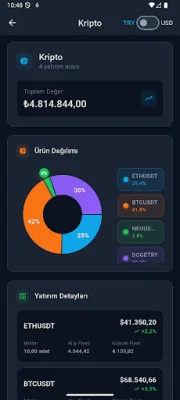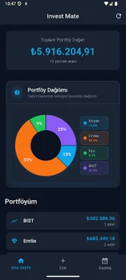 Invest Mate is a comprehensive financial application that allows you to track and analyze your personal investment portfolio. It offers a single platform to manage various assets such as USD, EUR, gold, cryptocurrency, BIST stocks, and more.
