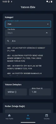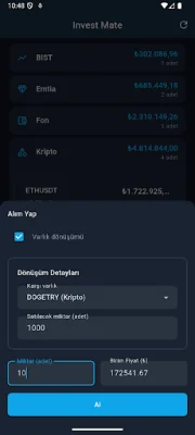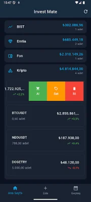 Some of the standout features of Invest Mate include a comprehensive portfolio tracker for currencies, cryptocurrencies, BIST stocks, gold, investment funds, and futures accounts. It also provides real-time prices for currencies, cryptocurrencies, BIST stocks, gold, and commodities with automatic updates.