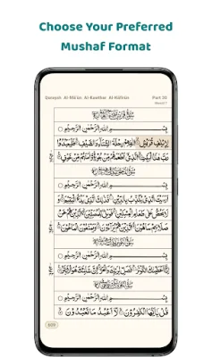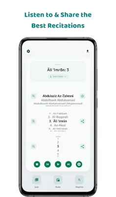 The application also provides a seamless recitation experience, with the option to follow along with synchronized recitation by Qurrā (reciters). Users can also listen to gapless verse-by-verse recitation by some of the world's best Qurrā, with full support for background playback. Additionally, there is a 24/7 Quran stream available for those who prefer to listen to the recitation.