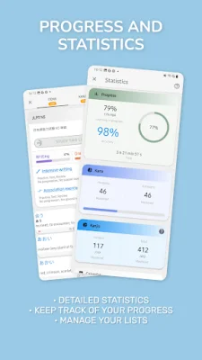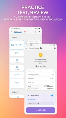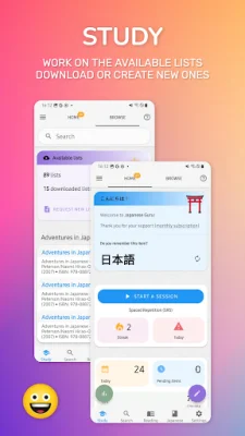 Our app offers a variety of lists and learning sessions to cater to your specific needs. You can choose from pre-made lists or create your own lists of kanji and words. The app also allows you to track your progress and review difficult elements or past errors. You can even export your lists and create writing sheets for further practice.
