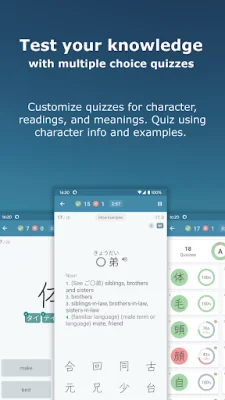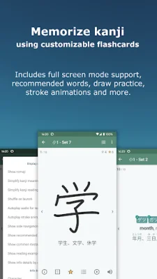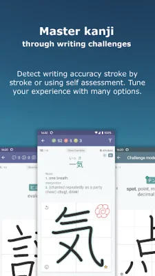 The app also offers a quick search feature for over 6,000 kanji and 180,000 words, with the ability to combine search criteria and see them highlighted in the results. Detailed information screens provide animated strokes, readings, meanings, and study stats for each kanji, as well as example words, sentences, and names. Additional features include studying kanji in various sequences, custom study reminders, native audio files for reading Japanese text, and the ability to save progress using Google Drive or local storage.
