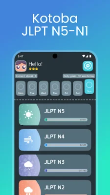 The app also offers a complete list of JLPT N5-N1 vocabulary, neatly organized and always up to date. This means that users can access all the necessary vocabulary for each level, from beginner (N5) to advanced (N1), in one convenient place. This saves time and effort for those studying for the JLPT, as they no longer have to search for vocabulary lists from different sources.