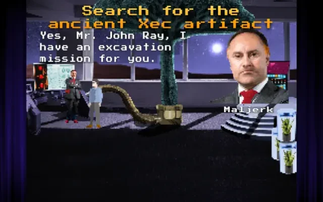 Archeology, Adventure, Artifacts. These are the three key elements of the exciting new game, "John Ray's Space Adventure." In this retro point and click adventure game, players take on the role of John Ray, a space archaeologist hired by the wealthy Mr. Maljerk. John's mission is to excavate and explore uncharted territory in the local star system, in search of ancient artifacts left behind by the technologically advanced Xec race.