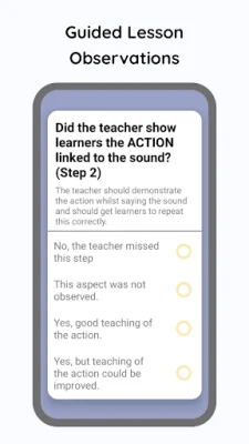 When using the Jolly Monitor app, officials will be prompted to answer a series of questions about the teacher and their lesson. These questions are designed to gather specific information about the teacher's use of the Jolly Phonics method, such as their understanding of the method and their ability to effectively implement it in their teaching. This information is crucial for providing valuable feedback to the teacher and helping them improve their teaching skills.