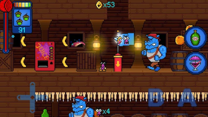 Your main goal is to play through all the different worlds and defeat the final boss. To help you on your journey, you can collect juicy fruit that will make you "Juiced!" and give you the power to light up your enemies. You can also collect coins and use them to purchase interesting powerups and powerful weapons that will aid you in your quest.