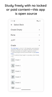 This application is designed for both beginners and advanced users who are interested in learning Japanese. It offers a flexible learning process that allows users to choose between studying hiragana, katakana, and kanji, or a combination of all three. Users can also follow JLPT levels, school grades, or Wanikani levels to tailor their learning experience to their specific needs.
