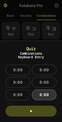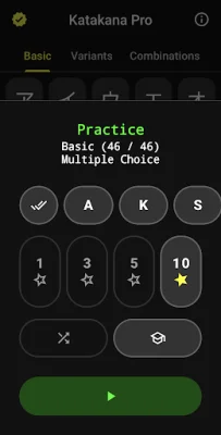 The Exercises application is designed to help users practice and improve their knowledge of the Japanese syllabary. It offers two main features: Practice and Quiz. In the Practice mode, users can earn points for each correct answer as they work their way through the syllabary. The Quiz mode challenges users to race against the clock and achieve the fastest time in each configuration.