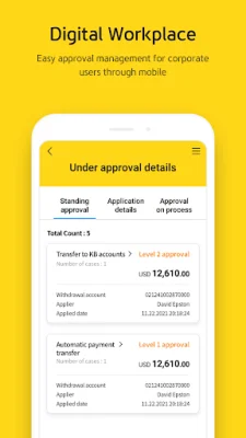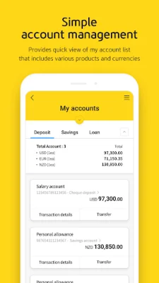 For account management, customers can check their account balances, transaction details, and exchange rates for all of their accounts. They can also make transfers to KB Bank, other banks, and for currency exchange or overseas transfers. The application also offers information on savings products, the ability to apply for savings accounts, and view transaction history. Customers can also access information on loans, including interest rates, interest payments, and check loan repayment results.