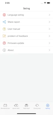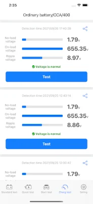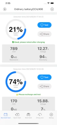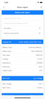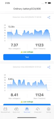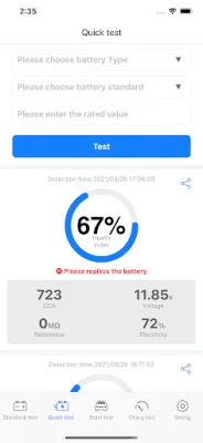 The app also offers a variety of testing options, including standard, fast, start, and charging tests. With just one click, users can generate detailed test reports and easily share them with others. This makes it easy to keep track of the battery's performance over time and identify any potential issues.