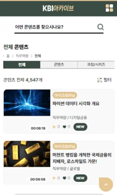 이 애플리케이션은 금융 직무 역량부터 직장인이 갖추어야 할 공통 역량, 그리고 리더십 교육까지 모두를 자유롭게 학습할 수 있는 공간을 제공합니다. 이를 위해 E러닝, 마이크로러닝, 숏폼 콘텐츠뿐만 아니라 실시간 콘텐츠까지 다양한 형태의 학습 자료를 제공합니다. 이렇게 다양한 콘텐츠 중에서도 학습자가 필요한 것만 선택하여 수강할 수 있습니다.