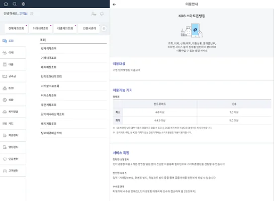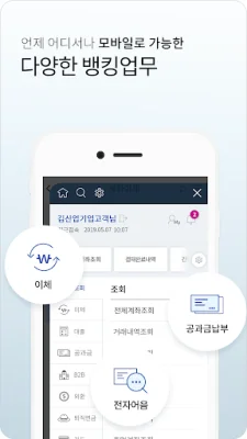 이 서비스는 언제 어디서나 함께하는 뱅킹을 제공합니다. 스마트폰만으로 다양한 조회 서비스와 이체서비스를 이용할 수 있으며, 공과금 납부와 부가세매입자납부거래(즉시결재), 본/지사서비스를 이용할 수 있습니다.
