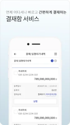 또한 이 서비스는 든든한 비즈니스 파트너가 될 수 있습니다. 스마트폰뱅킹으로 언제 어디서나 결재요청과 결재처리가 가능하며, 전자어음 발행과 전자어음 배서/분할배서의 서비스를 이용할 수 있습니다. 또한 전자어음의 다양한 조회서비스를 이용할 수 있습니다.