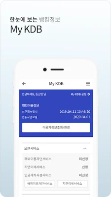 이 서비스는 신속한 알림과 맞춤정보를 제공합니다. 입출금 거래내역, 결재정보, 스마트보고서를 PUSH서비스를 통해 빠르고 편리하게 확인할 수 있으며, 뱅킹이용정보, 결재함, 자주찾는 계좌, 일정 등 다양한 뱅킹 정보를 한눈에 MY KDB에서 확인할 수 있습니다.