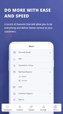 KFinKart is an application that helps you become more productive and efficient in providing excellent services to your customers. With its comprehensive service menu, intelligent features, and user-friendly interface, you can achieve faster results and increase your earnings. The app allows you to track each customer's portfolio and send reminders for new fund offers, SIP, repurchase, and redemption. All your earnings are pooled together, giving you instant access and visibility.