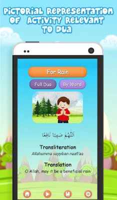 The app uses descriptive pictures to illustrate the purpose of each dua, making it easier for children to comprehend. The interface is designed to be user-friendly and appealing to children. It also allows for customization of font style, size, and features like translation and transliteration.