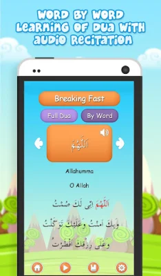 The Word by Word teaching feature displays the dua in Arabic with each word highlighted in a separate box, helping children focus on individual words. The translation and transliteration of the highlighted word are also provided to aid in understanding the meaning and pronunciation. The audio recitation feature allows children to listen to the complete dua while a highlighter scrolls through the words being read.