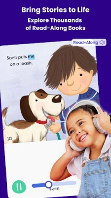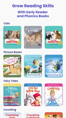 The app focuses on two main areas: learning to read and fostering a love of learning. For early readers, there are interactive books and activities that help develop literacy skills and build fluency. These include phonics books, read-to-me picture books, and word highlighting. Additionally, children can learn early concepts such as shapes, colors, letters, and numbers.