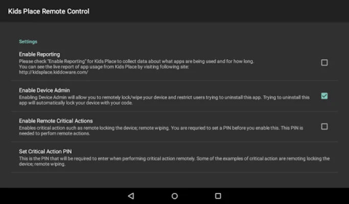 Kids Place Remote Parental Control & Monitoring is a powerful tool that allows parents to remotely manage the Kids Place Parental Control App on one or more devices. This app can be accessed through a cloud-based console at https://kidsplace.kiddoware.com, making it easy for parents to monitor and track their children's activities. With this app, parents can monitor their child's phone or tablet from any computer or mobile device through the website at https://kidsplace.kiddoware.com. This gives parents continuous access to remote control, tracking, and monitoring of their child's device. One of the main benefits of using Kids Place Remote Parental Control & Monitoring is the ability to prevent unwanted and malicious behavior from children. This app, in combination with Kids Place Parental Control, gives parents complete control over their child's device, allowing them to block dangerous websites and harmful apps. There are many reasons why parents should choose Kids Place Remote Parental Control & Monitoring. This app offers a cloud-based management tool, the ability to remotely add or remove apps from Kids Place, and change settings. It also allows for the export and import of configurations and the management of multiple devices. In addition, this app provides geo-location and device tracking, as well as a cloud-based reporting and dashboard platform. Parents can also view and monitor which apps their child is using and for how long. If necessary, parents can remotely lock or wipe their child's device for added security. Kids Place Remote Parental Control & Monitoring is easy to use and offers a free 15-day trial upon account creation. It is a great way for parents to add an extra layer of security and have peace of mind knowing that their child's device is protected. Download this app for free today and keep your child safe from cyber attacks, harmful apps, and viruses. Please note that this app may request the Device Administrator permission, which is completely optional. This permission is requested in case parents want to use the "reset-password" and "force-lock" user policies. These features allow parents to remotely change the device password and lock the device for their child's safety.