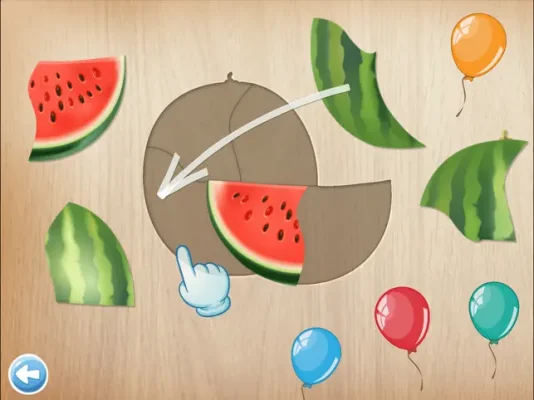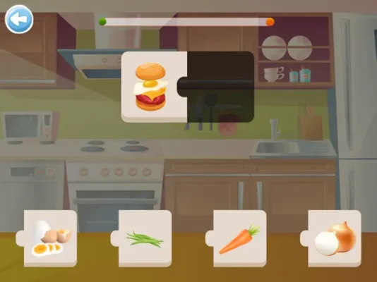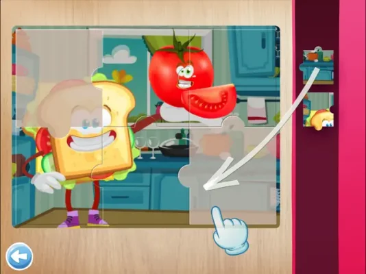 After correctly solving a puzzle, children will be rewarded with a balloon animation and happy cheering. The theme of this particular puzzle is "Food," but the app offers other themes such as "Animals," "Kitchen," "Furniture," "Bathroom," "Cars," and "Tools." This variety allows children to learn about different topics and expand their knowledge.