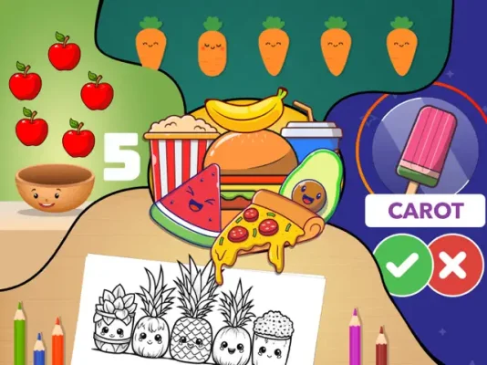 This application is designed to help children learn the names of various fruits, vegetables, and other food items in a fun and interactive way. Through games and play, children will be able to hear the pronunciation and see the written names of these items, helping them to become familiar with the alphabet and build their vocabulary, memory, and cognitive skills. The game is filled with animations, sounds, and interactive features to keep children engaged and learning. Parents can feel at ease knowing their children are occupied for hours while also improving their knowledge and skills.