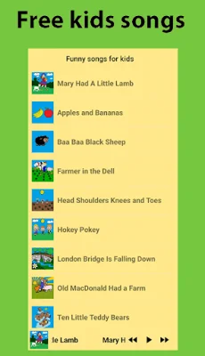 The "Kids songs" application is a free and offline platform that offers a variety of songs for children. It can be easily accessed without the need for an internet connection, making it convenient for parents and kids on the go. The user-friendly interface allows children to choose their favorite songs by simply clicking on the colorful pictures displayed on the screen. With a wide selection of songs, this app caters to both boys and girls, ensuring that every child can find something they enjoy.