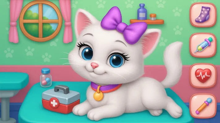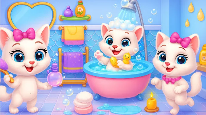 The game features various activities such as preparing meals, giving bubble baths, and even pampering your pet with a salon experience including grooming and nail care. Players can also dress up their kitties with stylish outfits, accessories, and hats, and play fun puzzles, coloring, and care games to earn rewards.