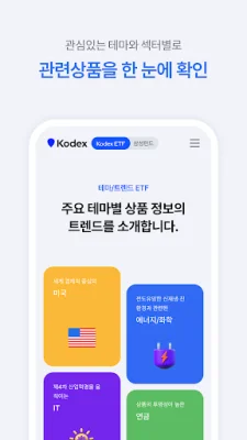 테마별 ETF 애플리케이션은 관심 있는 테마와 섹터별로 관련 상품을 쉽게 확인할 수 있는 서비스입니다. 이를 통해 사용자는 한눈에 원하는 정보를 얻을 수 있습니다.