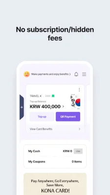This application provides a variety of benefits and convenience to its users. It serves as both a payment card and a transportation card, making it a one-stop solution for all your payment needs. Additionally, KONA CARD offers special benefits from its affiliated partners, specifically tailored for Korean tourism. These benefits include discounts and offers at amusement parks, duty-free shops, and local tourist attractions.