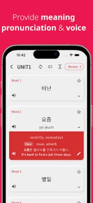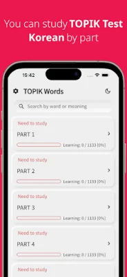 TOPIK words is an application that helps users learn Korean vocabulary. It offers a daily memorization feature, allowing users to easily study a set amount of words each day. The app also includes various tests to review the vocabulary learned that day, as well as audio pronunciation and example sentences for each word. Users can also review vocabulary by parts, units, or the entire Korean language.