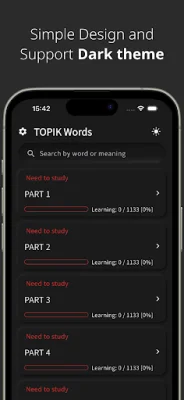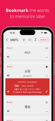For users struggling to memorize certain words, the app offers a "Favorites" feature where they can save words for further practice. The "Copy" function allows users to easily search for a word online for deeper study. Additionally, users can set or reset their learning progress for specific parts or units.