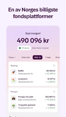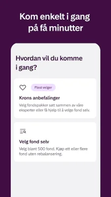 Kom i gang på noen minutter med Kron-appen! Sparingen din kan starte med bare 300 kroner, og du vil få en personlig investeringsplan basert på dine preferanser. Du kan også velge blant nesten 500 ulike fond hvis du ønsker det.
