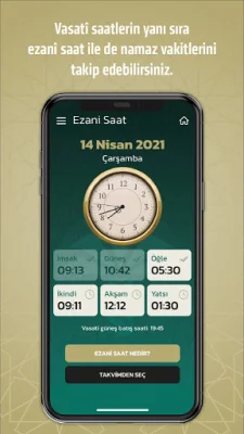 Kuveyt Türk Dijital Takvim, ezan ve namaz vakitlerini gösteren vasati saatlerin yanı sıra ezanî saatler de sunar. Dileyen kullanıcılar ezan ve namaz vakitlerini ezanî saat ile takip edebilirler. Ayrıca kıble bulucu özelliği sayesinde bulunduğunuz konumdan kıbleyi kolayca tespit edebilir ve dini günler ve geceler hakkında detaylı bilgi edinebilirsiniz. Ramazan ayında ise imsakiye bölümünü kullanabilirsiniz.