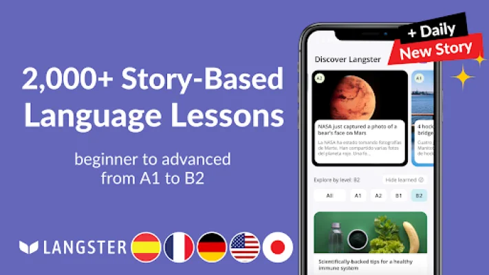 One of the main features of Langster is its use of real-world news and stories to create fun and bite-sized language learning courses for CEFR levels A1-B2. This immersion method has been scientifically proven to be effective in language learning. With over 2000 stories and news articles, users can learn in context and also receive grammar tips and vocabulary flashcard training. This makes Langster a comprehensive language learning tool.