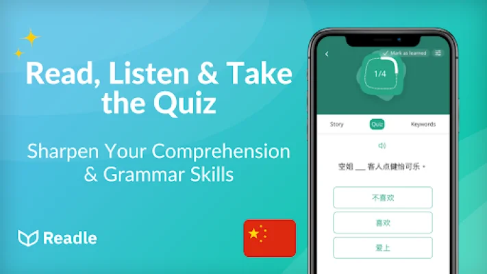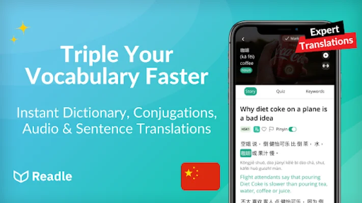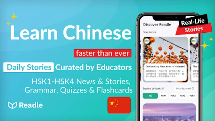 Readle is a highly-rated language-learning app that focuses on helping users master Mandarin Chinese. With just 10 minutes of practice a day, users can improve their skills from HSK1 beginner level to HSK4 advanced level. The app offers real-world news and stories, making it a practical and engaging way to learn Chinese. One of the main reasons to choose Readle is its tailored approach to learning. The app provides news and stories that are specifically designed for each user's HSK level, ensuring that the content is appropriate and challenging. This personalized approach is created by language experts, making it an effective way to learn Chinese. Readle offers a variety of features to help users improve their Chinese skills. These include flashcards, quizzes, and interactive learning tools that focus on vocabulary, grammar, and reading comprehension. The app also offers graded lessons for a more immersive learning experience. The app also includes a Chinese Pinyin Helper, which assists with reading and pronunciation. With native speaker recordings, users can practice their pronunciation and improve their fluency. Additionally, the app has an instant dictionary and translation feature, eliminating the need for external tools and saving time. Readle also offers a daily quiz feature to test users' knowledge and prepare them for HSK exams. The app's story library is constantly updated with over 2000 stories covering a variety of topics, such as travel, culture, food, and more. This allows users to immerse themselves in Chinese and learn about different aspects of the language and culture. Overall, Readle is a comprehensive and effective app for learning Mandarin Chinese. It is suitable for self-study, exam preparation, or for those planning to live or visit China. With its user-friendly interface and personalized approach, Readle makes learning Chinese accessible and enjoyable.