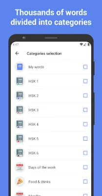 The app boasts a vocabulary of 5000 words, with thousands of Chinese words and phrases divided into thematic categories, including HSK levels 1-6. Users can choose the category they want to learn and easily switch between categories as they please. Additionally, users can also add their own words and categories, allowing them to create a personalized word base to focus on.
