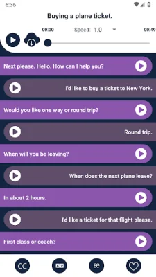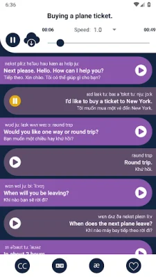 This app is a language learning tool that offers English lessons translated into 46 different languages. It also includes audio recordings and pronunciation guides to help users improve their listening and speaking skills. The app allows users to follow along with the speaker while listening to the audio, making it easier to understand and learn the language.