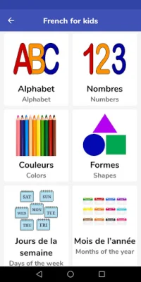 In addition to basic vocabulary, this application also covers more specific topics such as colors, shapes, and days of the week. These are essential words and concepts that are used in everyday life, and the use of pictures helps users to remember them more easily.