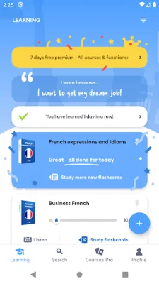 VocApp French is the best choice for those looking for the best French learning app. Our courses are created by professionals in linguistics and are constantly updated by native French speakers. Users can find lessons on a variety of topics, from basic language skills to more advanced financial terms.