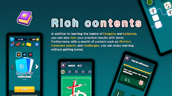 This application is perfect for those who want to learn the basics of hiragana and katakana, as well as more advanced concepts like DAKUON_HANDAKUON and YOUON. With a variety of rich content, including SHIRITORI, katakana search, and challenges, you can enjoy learning without getting bored. Plus, you can track your progress with tests to see how much you've improved.