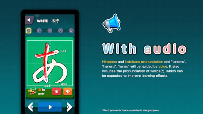 One of the standout features of this app is the inclusion of audio. Not only can you hear the correct pronunciation of hiragana and katakana, but you can also listen to guidance on TOMERU, HANERU, and HARAU. This app even includes word pronunciations, making it even more effective for learning.