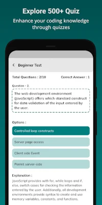 If you have an interest in web development, the Learn JavaScript App is the perfect tool for you. This app is designed to efficiently teach you how to create web development programs. With over 200 JavaScript exercises, including outputs, questions, and quizzes, our app offers a comprehensive learning experience. All programs have been thoroughly tested and are compatible across all platforms, making it easy for you to learn and practice anywhere, anytime.