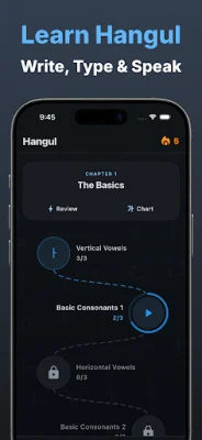 Inside the app, you will find the ultimate Hangul masterclass, starting from the very basics. You will learn the Korean alphabet by mastering the building blocks of the language: initial consonants, vowels, and final consonants. The app also offers features such as voice recording and instant pronunciation analysis, guided stroke-order tracing for handwriting practice, and exercises for typing, writing, and speaking to help you practice every modern Hangul character.