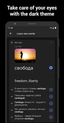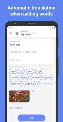 In addition, ReWord offers a night theme for comfortable learning before bed and the ability to learn Russian offline, making it easy to incorporate language learning into your daily routine. The app also boasts a simple and clear interface without any distracting elements.