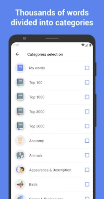 The app boasts a vocabulary of 5000 words, all divided into thematic categories for easy learning. Users can choose which category they want to focus on and can easily switch between categories as they please. Additionally, users have the ability to add their own words and categories, allowing them to personalize their learning experience and focus on the words they want to master first.