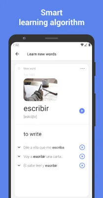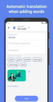 One of the most helpful features of ReWord is its use of flashcards with pictures and example sentences. These flashcards serve as mental shortcuts to help users build their vocabulary and understand the nuances of word meaning and usage in real-life situations.