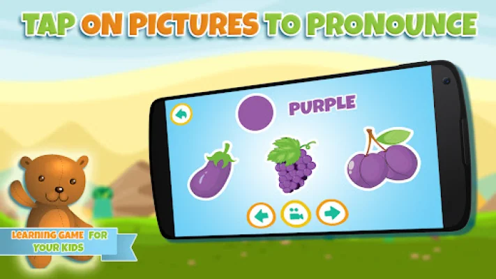 The Colors Learning for Babies, Kids and Toddlers application is an educational game designed for young children to learn basic colors and English words in a fun and engaging way. The game features various objects such as fruits, vegetables, and animals, and teaches children to recognize and name colors through interactive gameplay. The interface is simple and easy for even the youngest children to navigate.