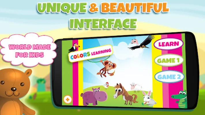 The game offers three different modes: "Learn Colors," "Game One," and "Game Two." In "Learn Colors," children can see and hear the name of a color and match it to three corresponding objects. In "Game One," children must match colored circles to the same colored circle, while in "Game Two," they must match objects to their corresponding colors. These games not only help children learn colors, but also improve their memory, brain function, and creativity.