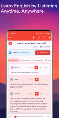 Our application utilizes resources from BBC Learning English, ensuring high-quality and reliable content. Our key features include short and engaging lessons that are ideal for busy learners, bilingual subtitles in English and Vietnamese to help you follow along and understand better, and interactive exercises to boost your communication skills in listening, speaking, and vocabulary. You can also download lessons for offline access and we provide weekly updates with fresh content from BBC Learning English and other trusted sources.