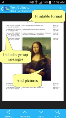 This application allows users to preview the results for free, but a one-time in-app purchase is required to unlock the share feature. It collects SMS and MMS messages, as well as some types of Advanced Messaging. The app includes images and attachments that are not images, and organizes messages by conversation. Users can choose to collect all messages or filter by date.